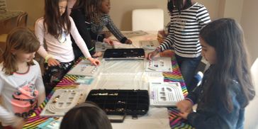 They contain material for a bracelet (assortment of acrylic and glass beads, charms, a pre-cut stretchy cord), and a jewelry pouch.